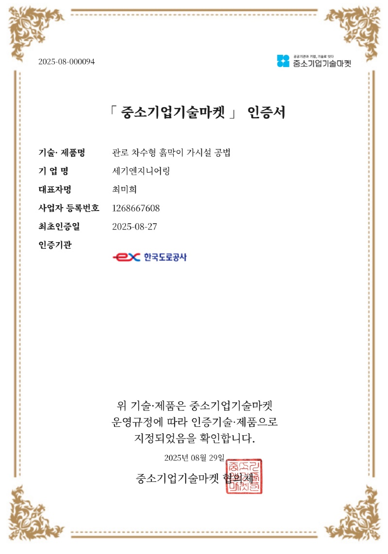 ■ 세기엔지니어링의 혁신적인 **SWAP 공법(차수 흙막이 가시설)**이 한국환경공단과 한국도로공사 중소기업기술마켓에 기술 등록을 완료했습니다. 이는 기술의 우수성과 신뢰성을 공식적으로 인정받은 의미 있는 성과입니다.